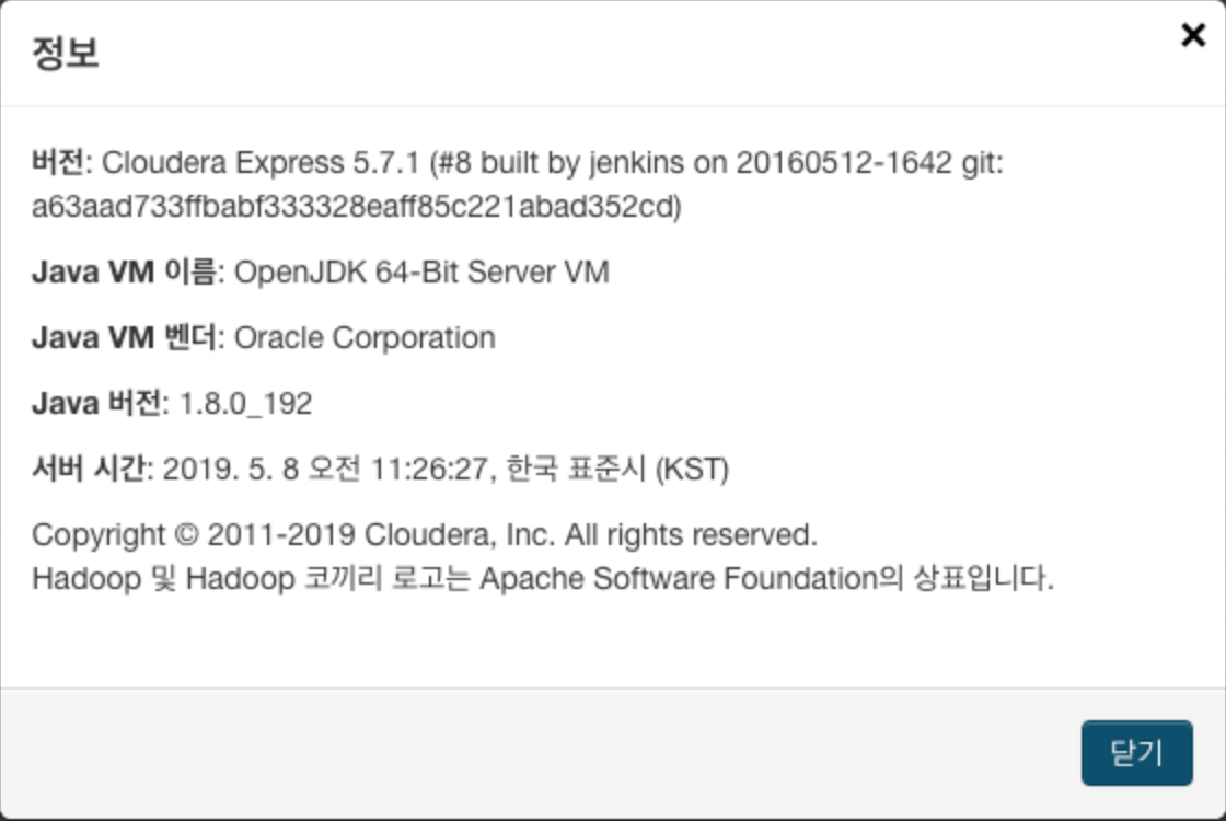 - Cloudera Manager > 지원 > 정보 에서 JDK 버전 확인