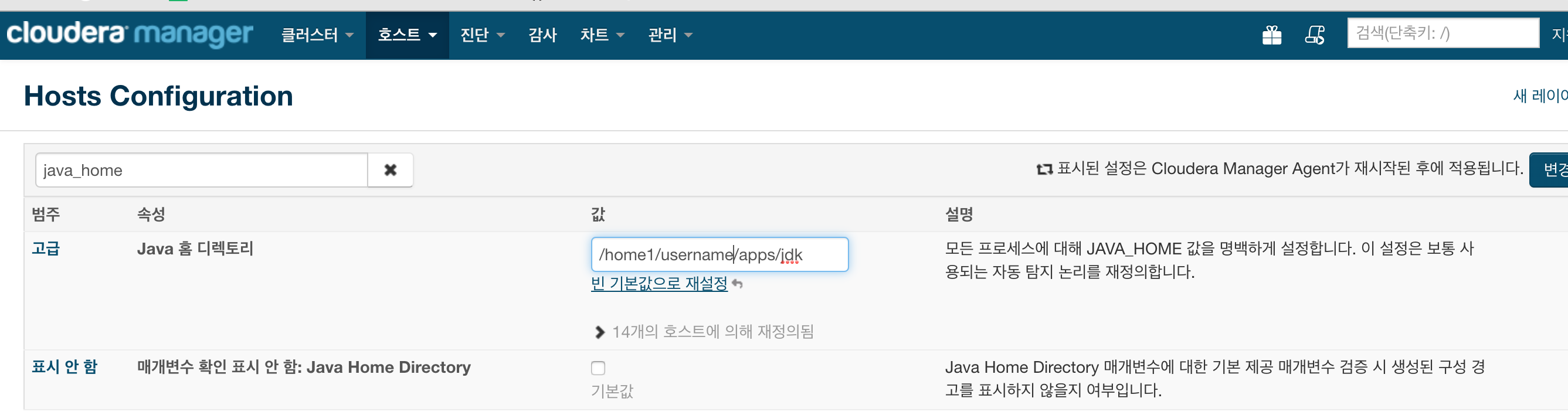 클라우데라 > 호스트 > 구성 > 고급 > java 홈 디렉토리 설정.